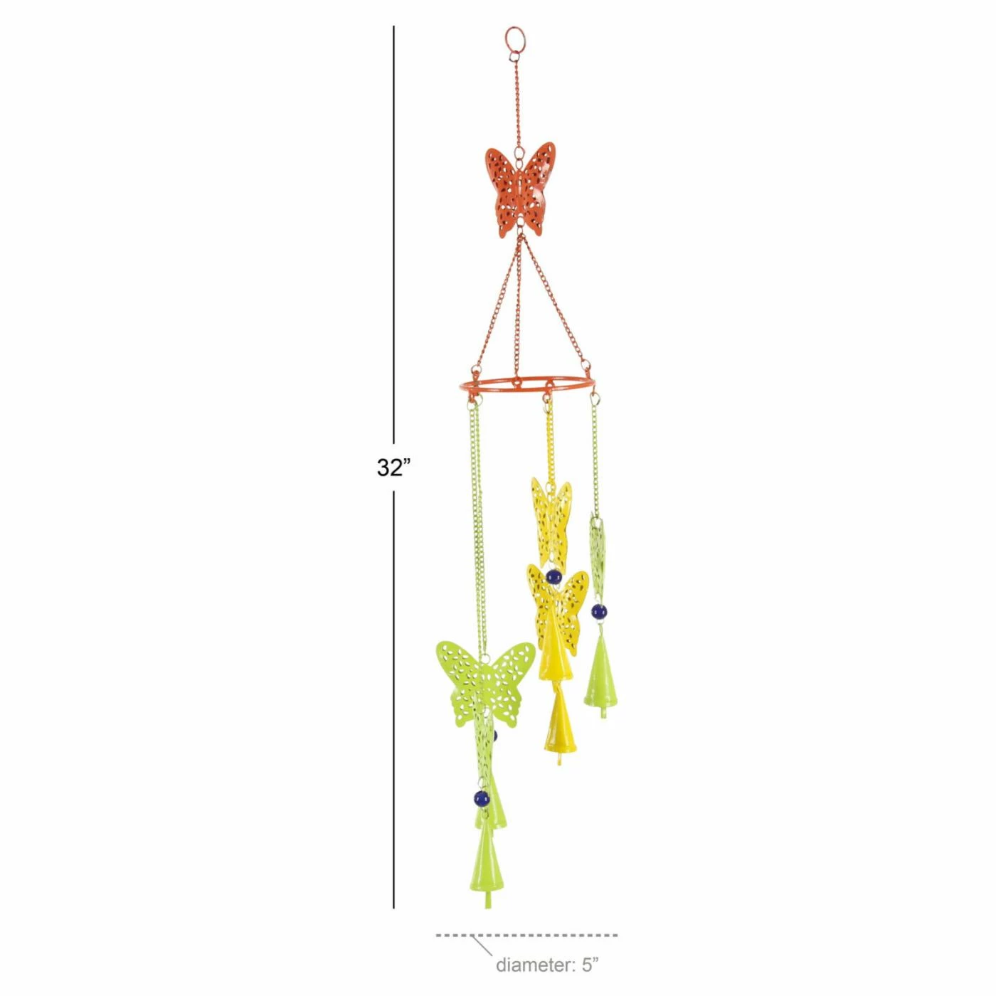 Each butterfly ornament on the DecMode 32 in. Butterfly-Inspired Wind Chime features all-over cut outs, creating a multi-dimensional look. The metal butterflies on this wind chime are finished in vibrant colors, adding a dose of cheer to your home dรฉcor.