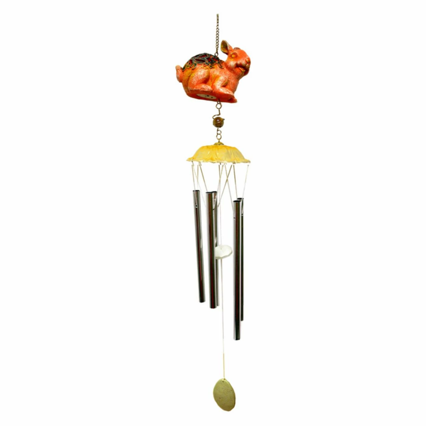 Finished in orange and yellow for a colorful silhouette, the Great World Rabbit Figurine Wind Chime adds a whimsical touch and soothing sounds to your outdoor living area. Crafted from wood, resin, and aluminum, this rabbit wind chime comes to life with a soft breeze.