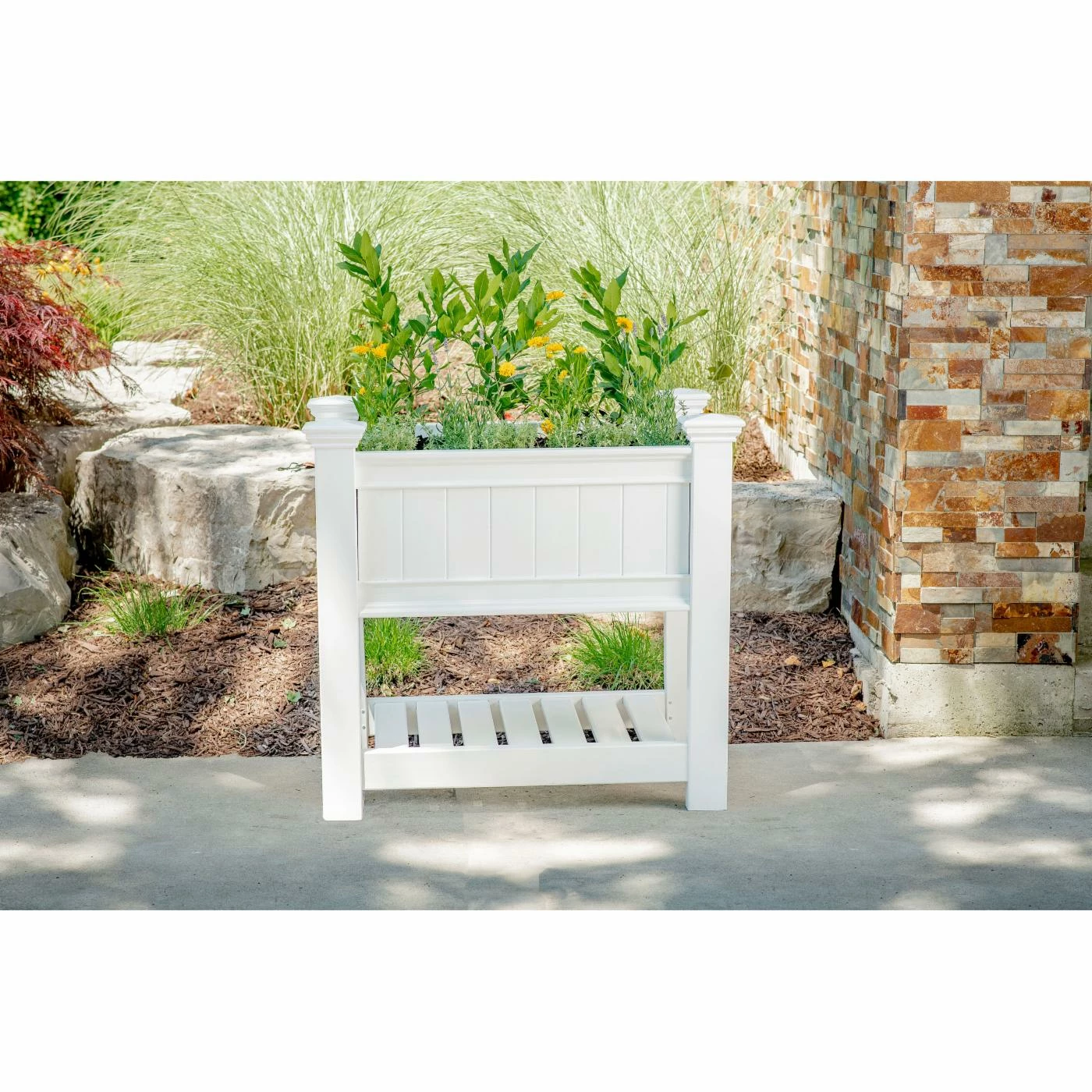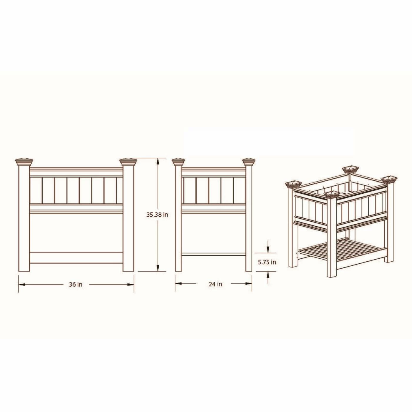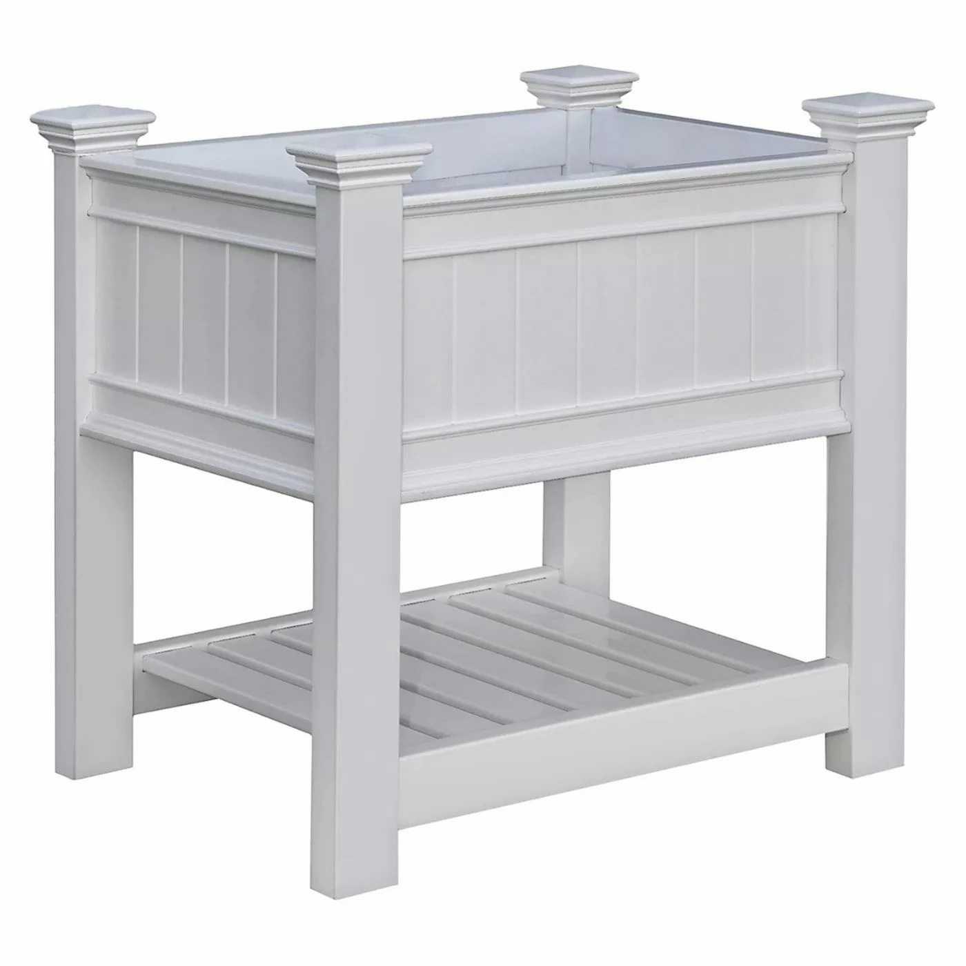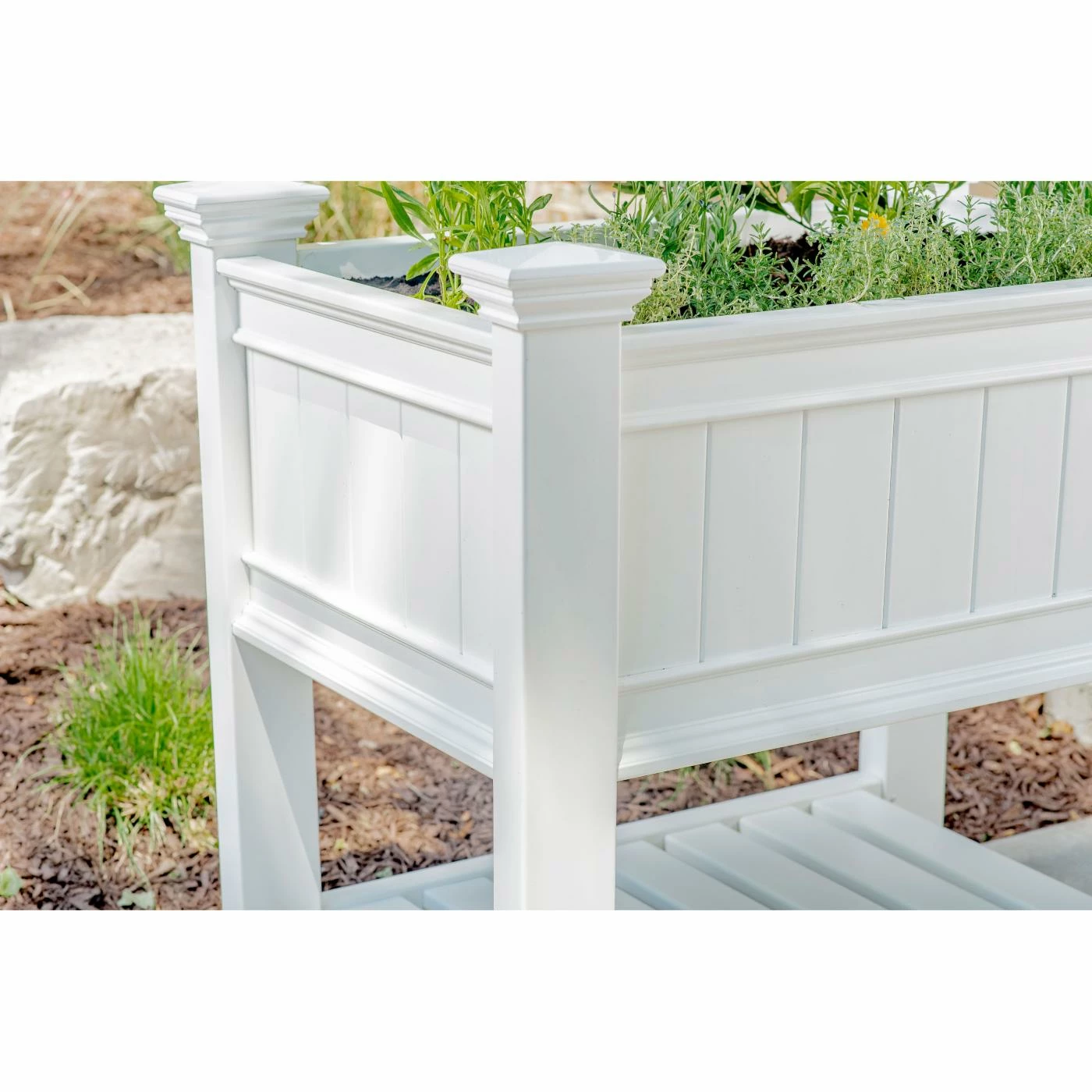 With the Vita Cambridge Vinyl Raised Planter Box, perfect flowers and vegetables — with less weeding, less pests, and no soil compaction — will be right within your reach. No more back discomfort! Attractively designed with architectural detailing to compliment any outdoor setting, the Cambridge Raised Planter even has a shelf to store pots, soil, and gardening equipment.
