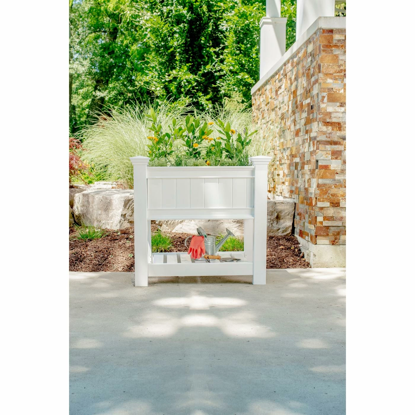 - Lower shelf offers storage for tools, pots, and soil