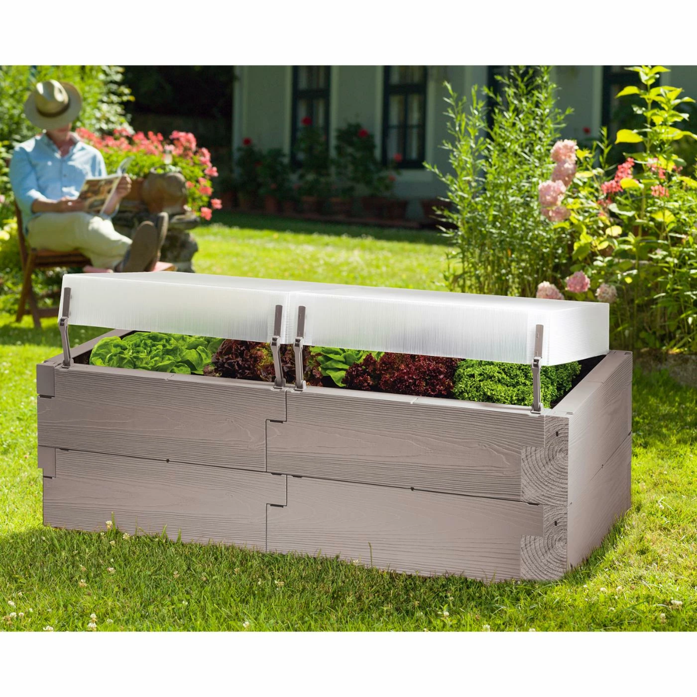 Keep juicy vegetables, herbs, or other plants protected from pests and weather with the Exaco Trading Double Layer Raised Bed. This BPA-free and 100% recyclable raised garden bed features a double layer wall of 12 bricks, making it easy to garden without bending over or hurting your knees. The included cold frame cover has twin-wall polycarbonate sides and top to keep your plants protected during chilly weather. The four aluminum braces down the middle makes the raised bed extra sturdy. Choose from available base finish colors.