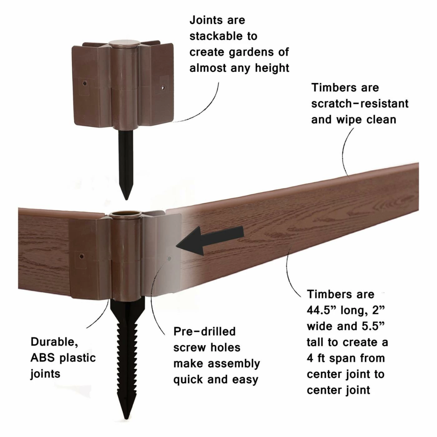 - Timbers will not rot, warp, splinter, or fade