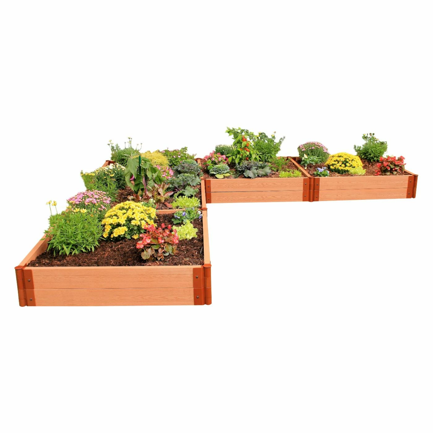 With its bold two-inch timbers and smart L-shape design, the Frame It All Tool-Free Composite L Shaped Raised Garden Bed Kit is a simple solution for backyard gardening. This kit provides plenty of planting area, and its generous 11-inch bed works well for both flowers and vegetables. The timber is eco-friendly and helps maintain the soil temperature throughout the growing season. Plus, reinforcing bracing boards provide stability and act as dividers to keep your raised bed organized.