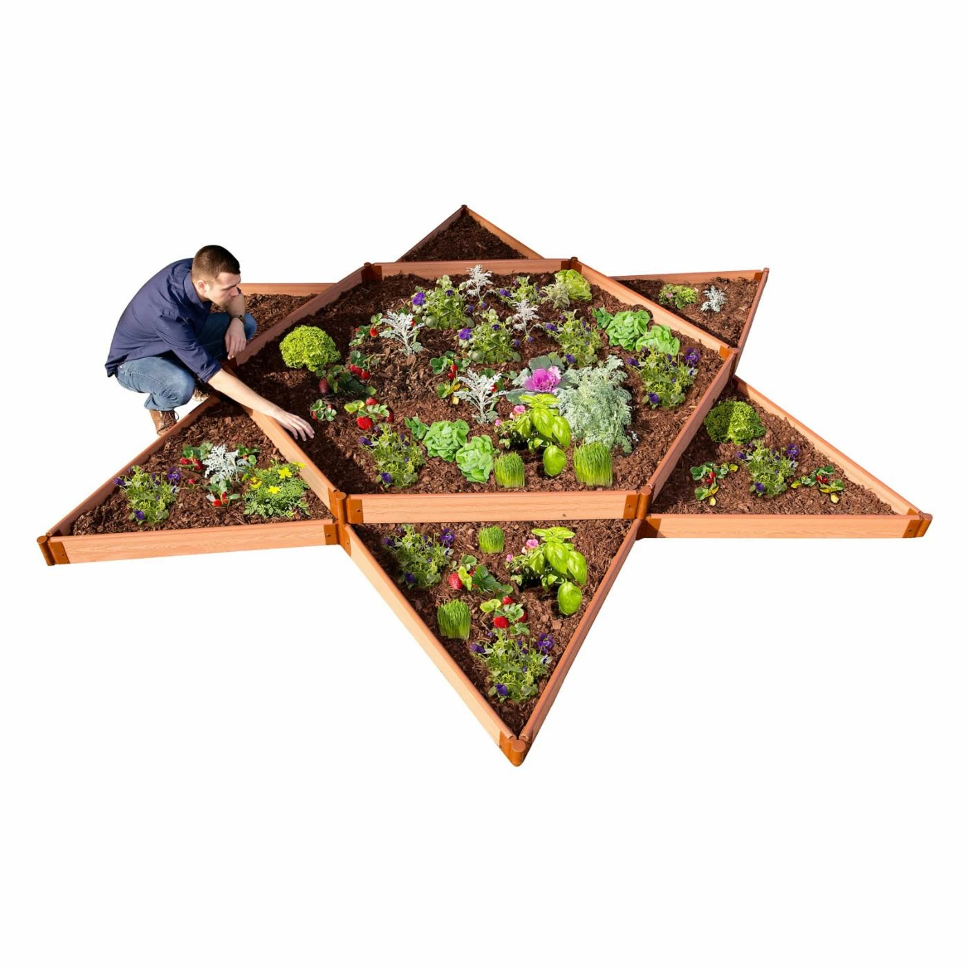 The Frame It All Tool-Free Composite Star Shaped Raised Garden Bed will shine as a focal point in your courtyard, patio, or landscape design. The tiered design is well-suited for growing flowers or vegetables of varying heights. Its unique modular layout offers endless design possibilities and can be configured into three 5.5-in.-high hexagon raised beds if you prefer. Eco-friendly timbers are made from insulating composite board for optimal gardening conditions spring through fall.