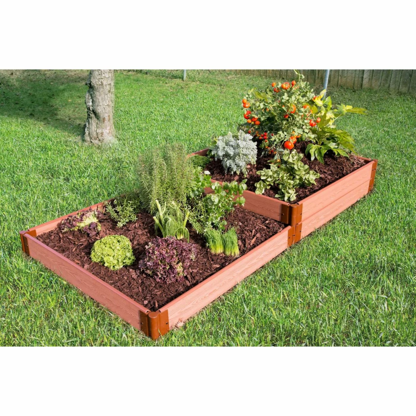 Multiple levels and a terraced design ensure this Frame It All Tool-Free Composite Terraced Raised Garden Bed Kit delivers maximum options in minimal space. The soil depth of the two-level section allows for any type of crop, even root vegetables. The one-level section is perfect for bedding plants, herbs, or strawberries. Patented anchor joints make it a snap to install on classic soft landscapes or hard surfaces like rooftops, patios, or decks.
