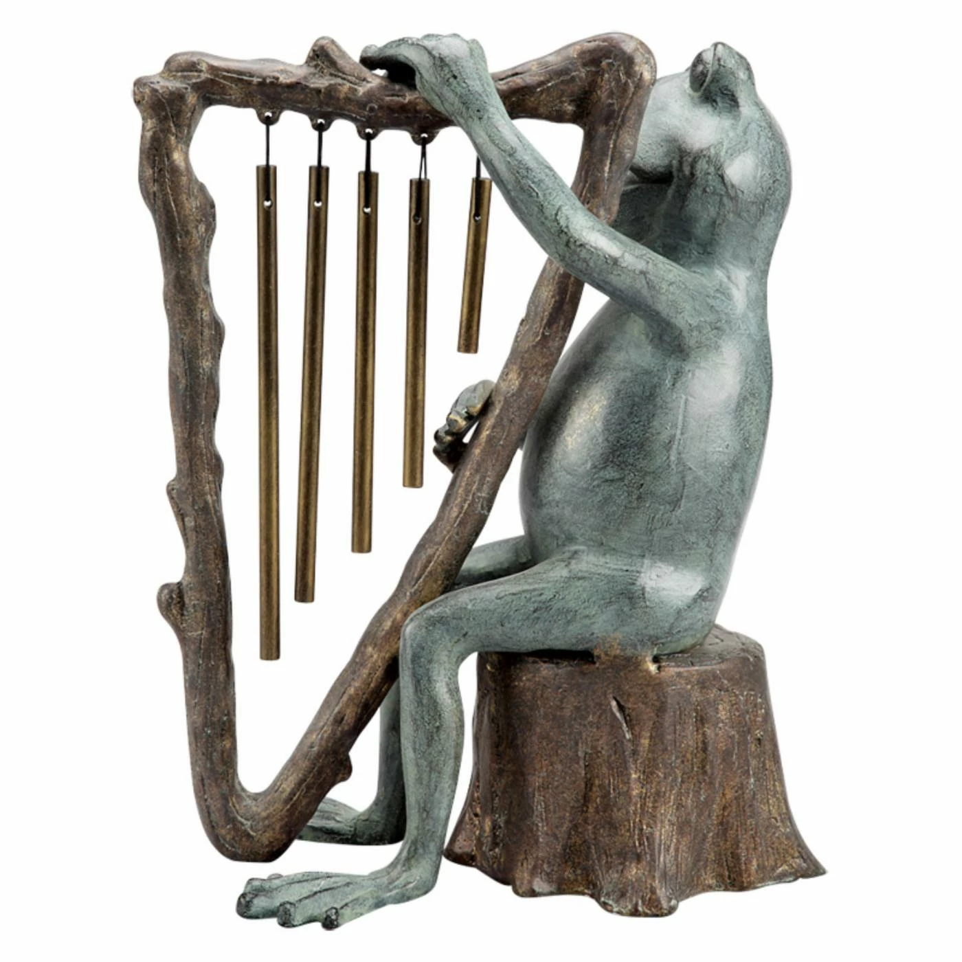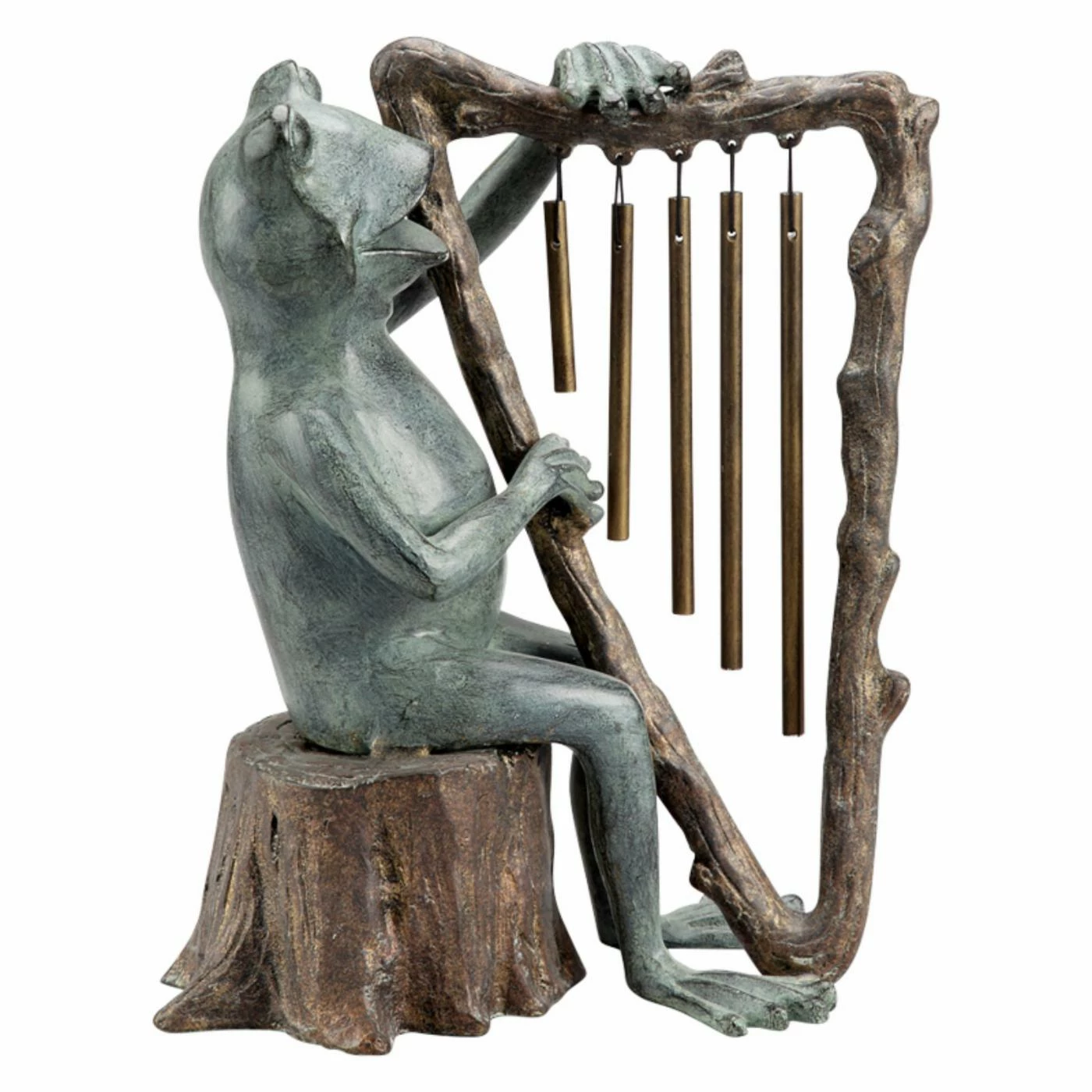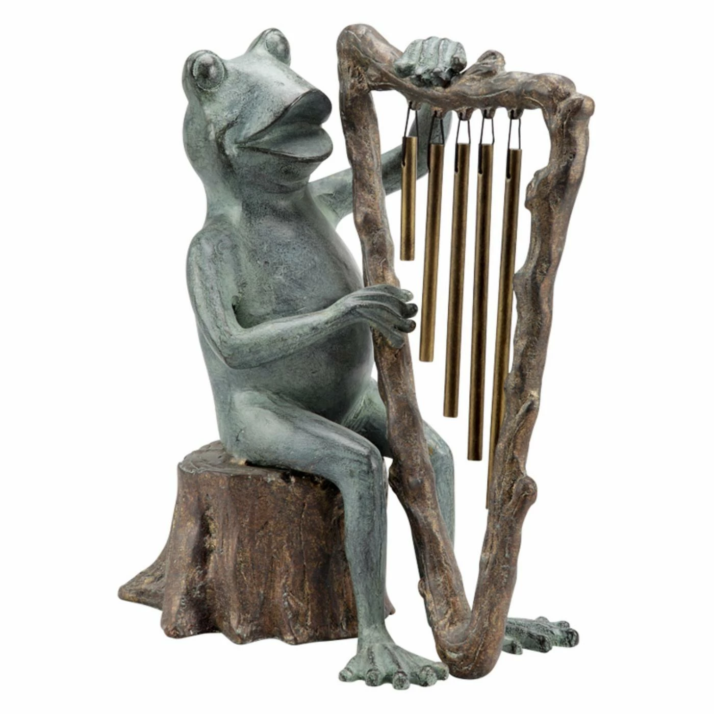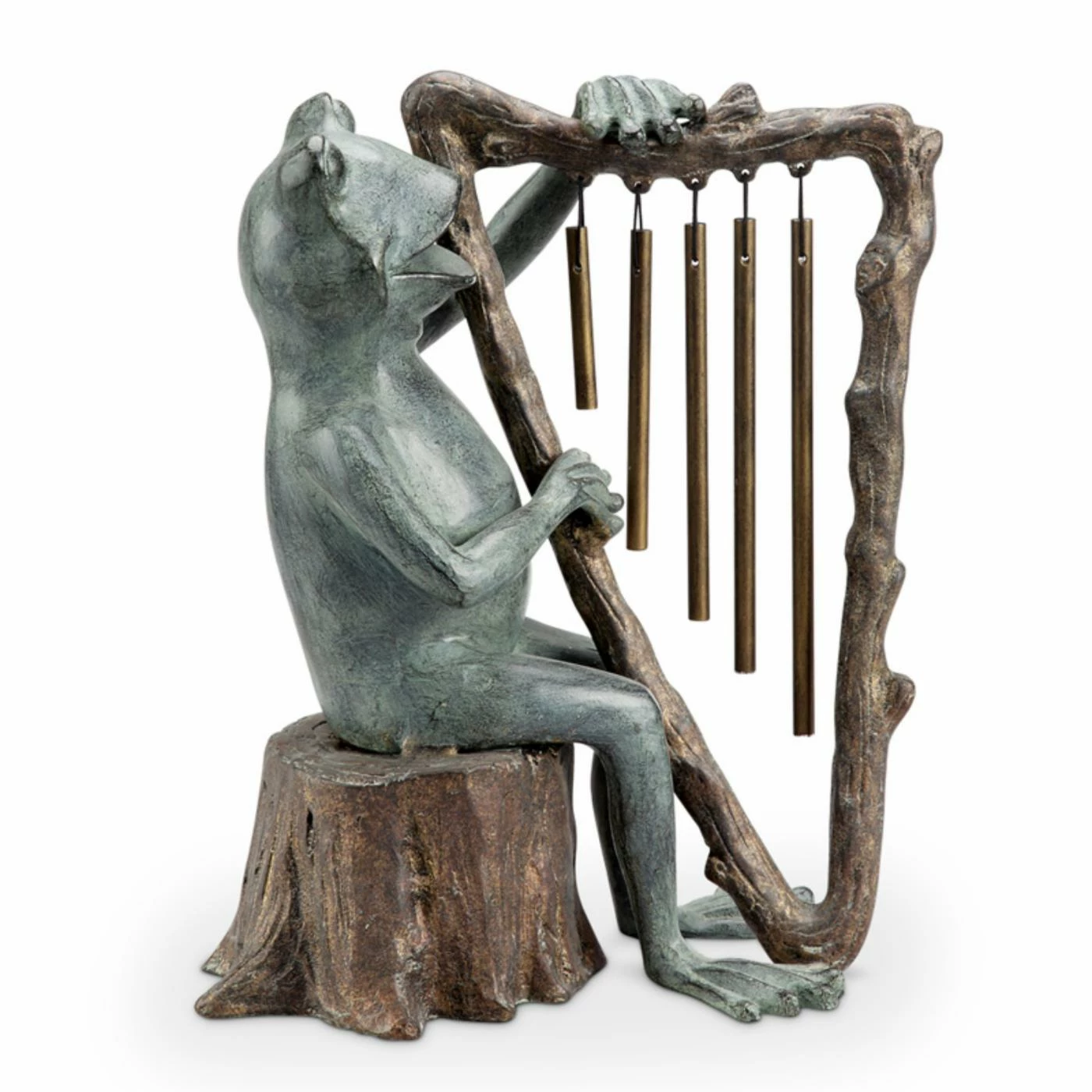 Let your outdoor space sing by decorating it with the San Pacific International Frog and Harp Tube Wind Chime Garden Statue. This frog sculpture features a sweet wind chime within his harp.