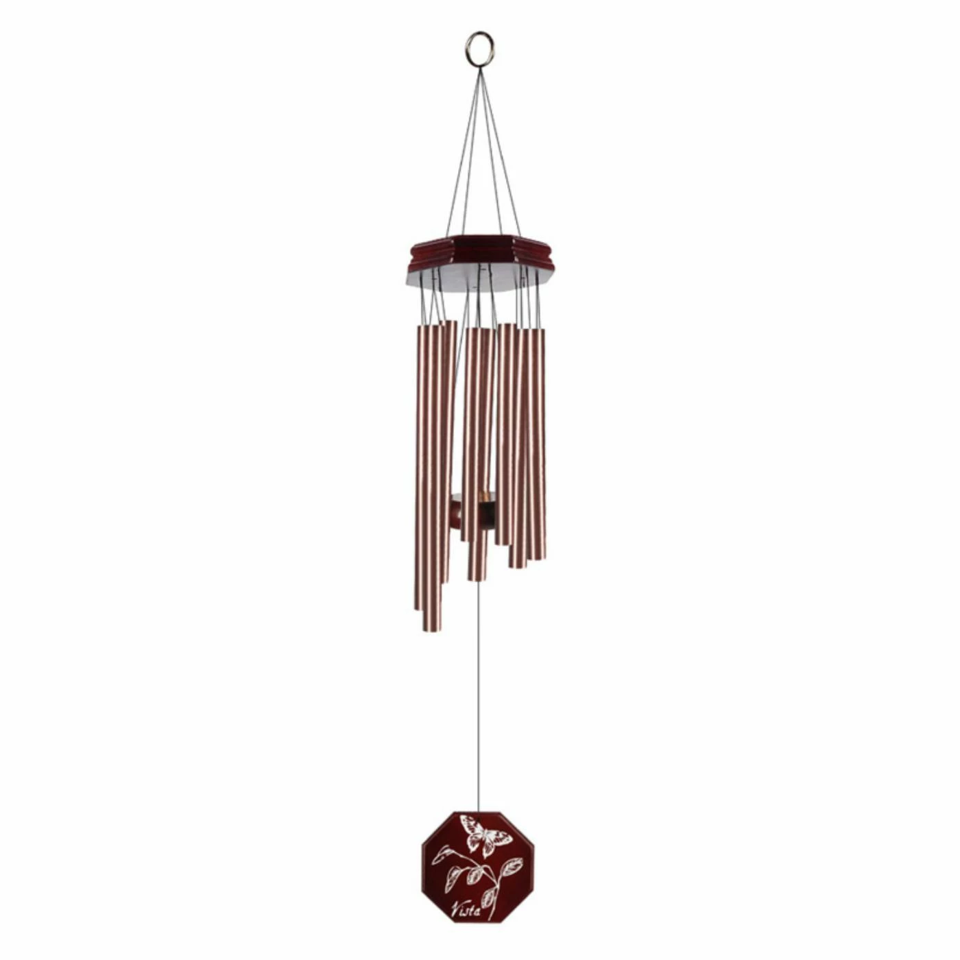 Create Zen-like serenity on your deck with the Sunset Vista 26 inch Bronze Wind Chime. This 26-inch long wind chime features 8 aluminum rods with bronze finish. A hardwood top, striker, and wind catcher are finished in dark wood with a white butterfly accent. Sure to bring music to any outdoor space.