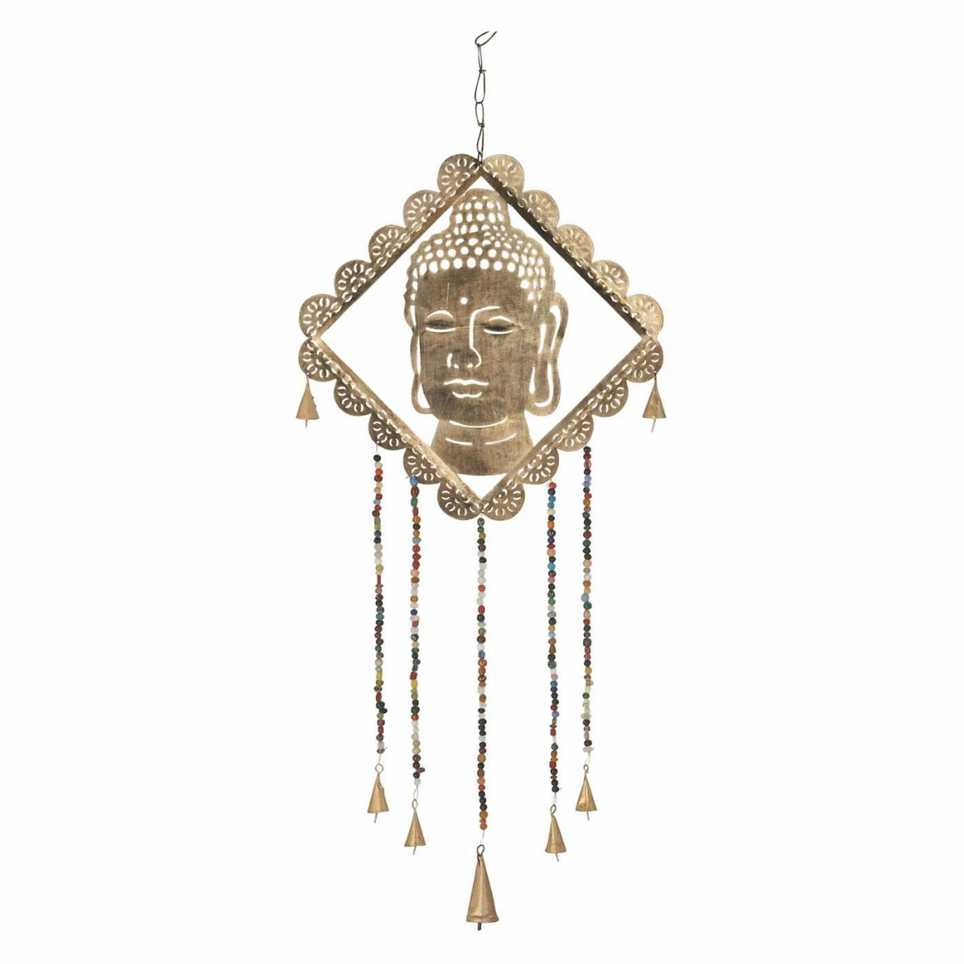 Make your outdoor space more relaxing with the DecMode 30 in. Buddha Face Wind Chime, showcasing an intricately detailed Buddha face design. This sturdy yet lightweight wind chime features metal construction, small bells, and colorful glass beads along with a sleek gold finish for an elevated aesthetic.