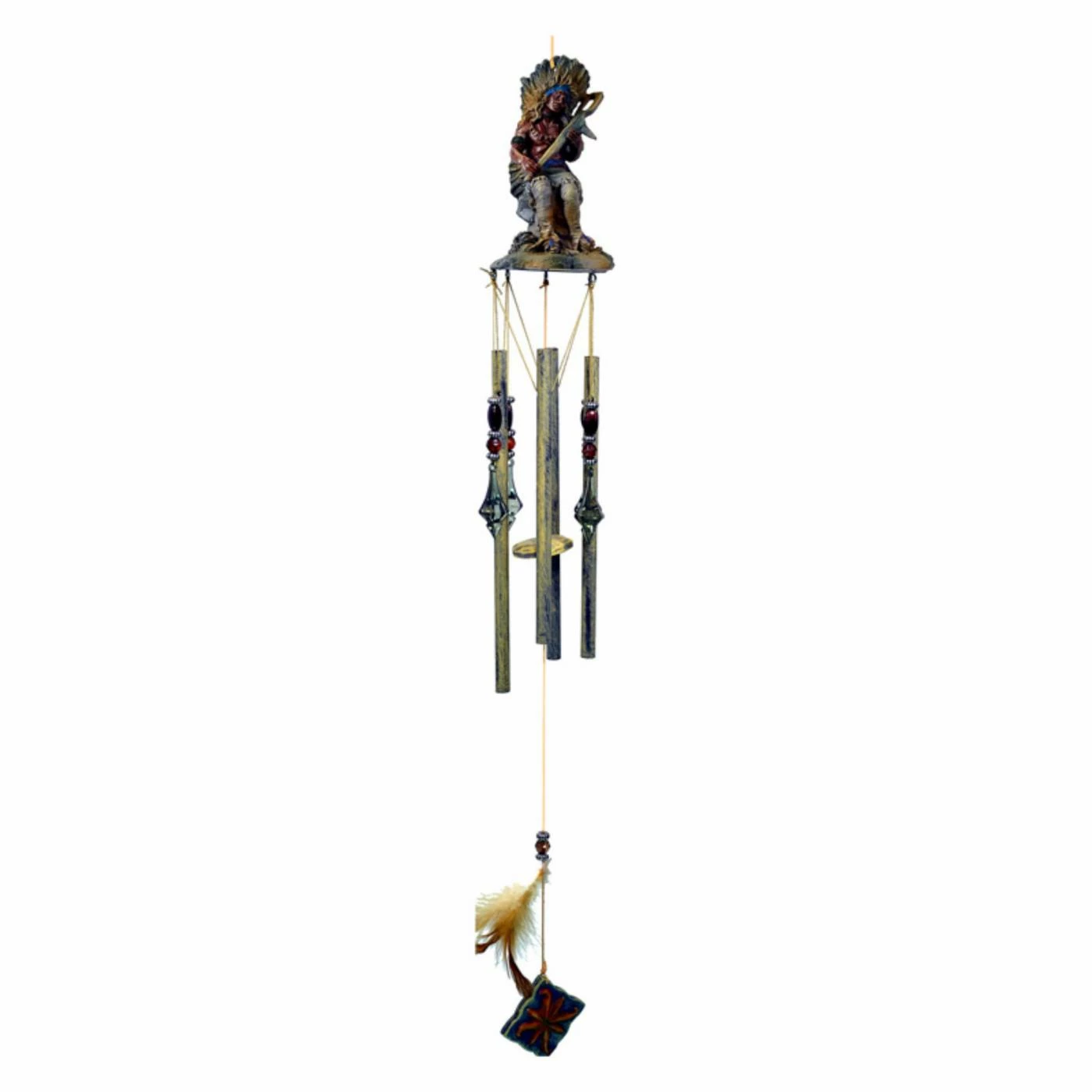 The four-tube Great World 31 in. Warrior Wind Chime features a Native American sitting atop the wind chime. Its metal, resin, and wood construction makes this piece suitable for both indoor and outdoor use.