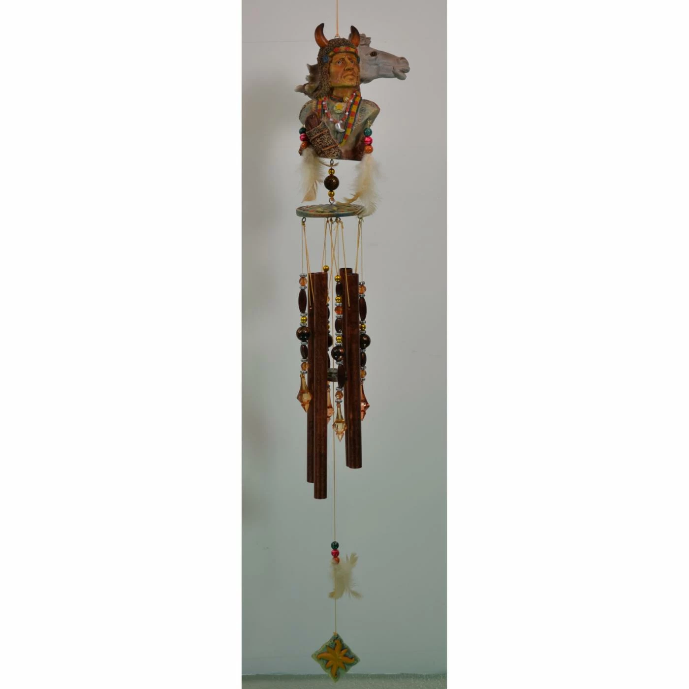 Beautifully detailed, the Great World Warrior Horse Indian Wind Chime infuses your porch or patio with a majestic, Native American-inspired design. Constructed from polyresin and aluminum, this wind chime features a warrior and horse silhouettes that’s embellished with beads and feathers for a traditional look. The darkly hued, tubular chimes deliver deep and soothing tones throughout your outdoor space.
