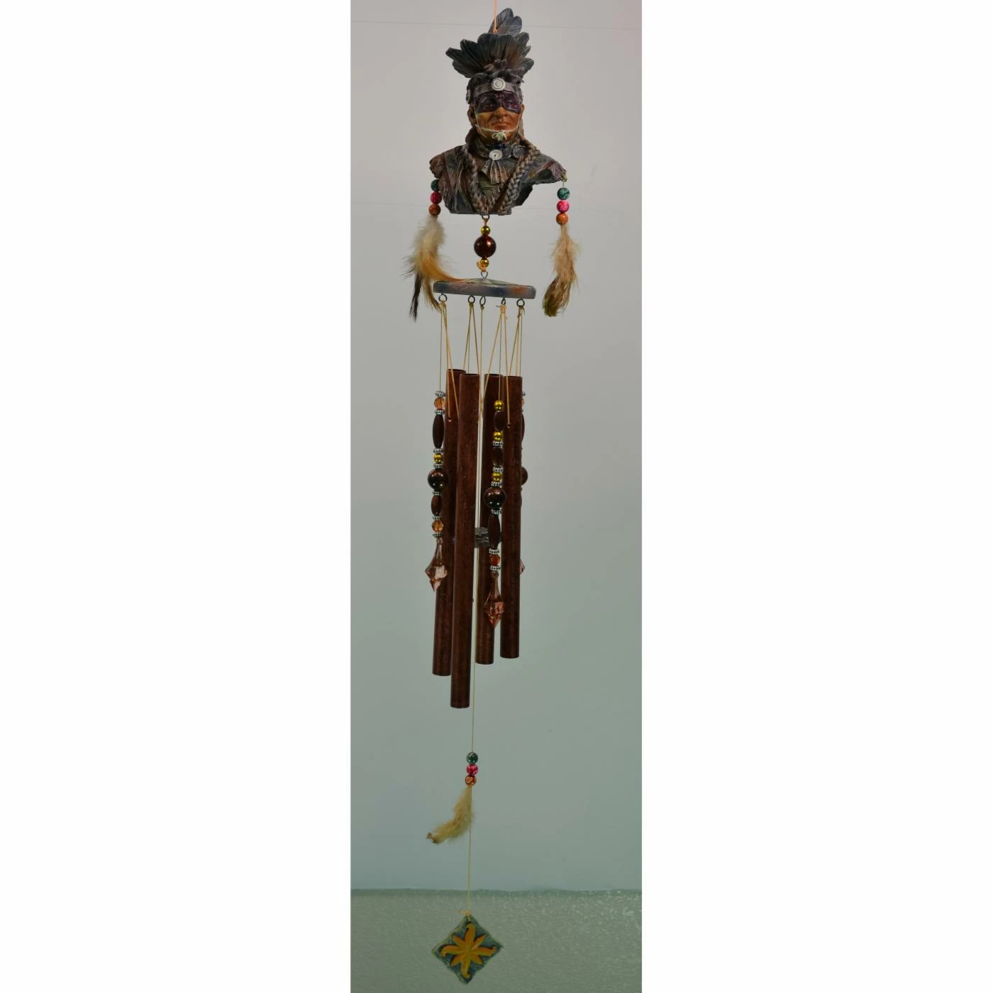 Grace your porch or patio with the brave and regal style of the Great World Warrior Indian Wind Chime. Exquisitely detailed, this proud warrior wind chime is beautifully accentuated with bead and feathers for plenty of Native American appeal. Four darkly hued, tubular chimes deliver deep and melodious sounds from this polyresin and aluminum d&ecute;cor when rustled by a passing breeze.