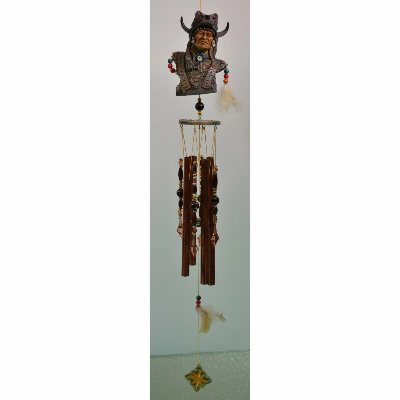 Embellished with beads and feathers, the Great World Warrior Wolf Indian Wind Chime brings a Native American-inspired beauty to your outdoor area. Exquisitely detailed, this polyresin and aluminum-crafted wind chime features a brave warrior enrobed in a wolf hood. Darkly hued, suspended tubes deliver a deep and melodious sound when brushed by a subtle breeze.